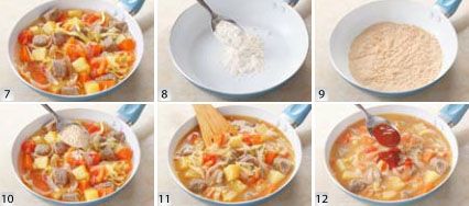 另起一锅,净锅放入面粉,小火炒至微黄之后,将其倒入熬煮汤的锅中,搅拌均匀,烧煮片刻后放入番茄酱、黑胡椒碎和盐调味即可。