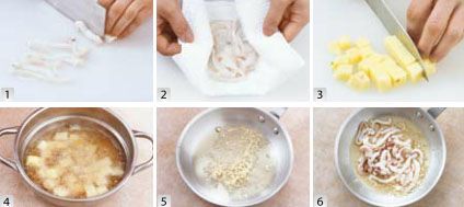净锅中放入少许油烧至五成热,即手掌能感到明显热气的时候,放入蒜末爆香,然后放入墨鱼圈大火翻炒,加入土豆炒匀。放入孜然、椒盐、辣椒粉翻炒至食材熟透。最后加入酱油和葱花炒匀出香味即可。