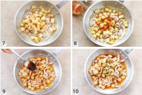 土豆去皮切成大约 1.5cm 见方的方丁,放入清水中漂洗充分后,沥干水分。将土豆丁放入五成热的油温中,中火炸制,看到表面微焦后盛出沥油。