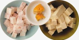 先把豆腐洗净切小块,把咸鸭蛋黄压碎加5勺水拌匀,芋头切块。