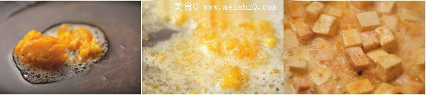 放入蛋黄轻炒两下。豆腐上色以后放入少量高汤、味精、鸡精。