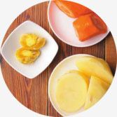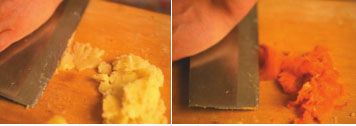 咸鸡蛋黄捣烂,胡萝卜、土豆一起蒸熟捣烂,姜切末。