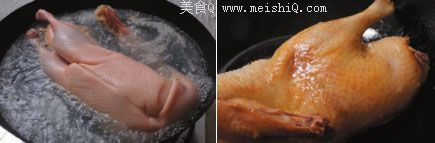 1. 鸭空腹宰杀,用80℃左右的热水浸烫煺毛,洗净后在肛门上部开膛挖出内脏,取出气管、食管,洗净后斩去鸭掌,用铁钩勾住鸭鼻孔,挂在通风干燥处晾干;