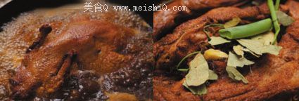 在平锅内起少量的油,放入姜片、小葱,爆香、煸炸至呈金黄色时,将鸭子放入锅内,用小火慢慢煎至鸭皮出油。