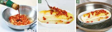 炒锅中倒油烧至七成热,下入剁辣椒、蒜蓉、姜末一起爆香,放入蒸鱼豉油调味,制成剁椒蒜蓉酱。再将酱汁均匀淋在娃娃菜上,上笼蒸制约 6 分钟。