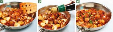 炒锅中加热少许香油,倒入八角、蒜末、姜末爆香,放豆瓣酱炒均匀,再入茄子煸炒,炝以料酒,加少许清水焖一会儿,这样更易入味。
