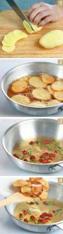 炒锅中放油烧至五成热左右,即锅上方可以感到明显热气的时候,改中小火,先把土豆片放入,炸成金黄焦脆,捞起备用。