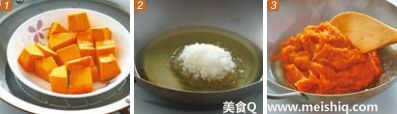 炒锅中热油将白糖略炒,放入南瓜泥不断翻炒至绵软,撒少许盐,和成南瓜泥,盛出冷却。