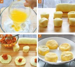 面团分切成块,将南瓜泥裹入面团中,把边缘慢慢收紧。