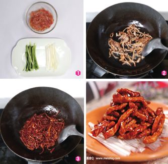 锅中留少许底油,放入番茄酱、甜面酱和白糖以小火翻炒,待炒至酱香浓郁并冒起小泡泡时,倒入肉丝以中火翻炒上色(图③),最后再淋入适量香油炒匀即可。