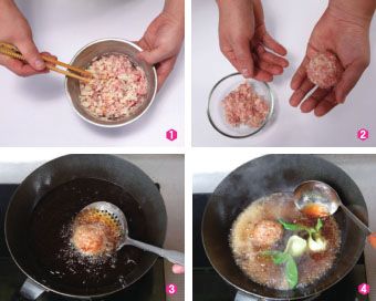 用手捏握成肉丸子(图②),放入热油锅以大火炸成金黄色,捞出(图③)。