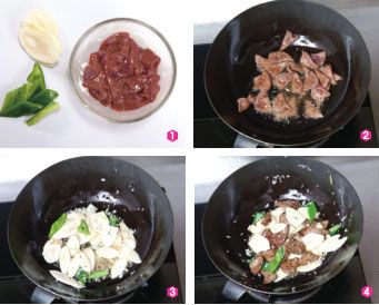 热锅入油,油热后下入猪肝片以大火爆炒(图②),至猪肝片变色后盛出;另起油锅下入茭白片,炒软后再下入青椒片稍炒(图③),盛出。