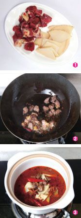 将牛腩移到汤煲里,加水、姜片、大料、陈皮,中火煮沸后撇去浮沫,转小火慢炖约40分钟,待牛腩软烂后,加入冬笋块煮熟,加盐调味即可(图③)。