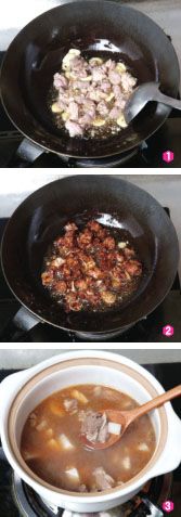 将锅内原料倒入煲里,加入荸荠块、白萝卜块、当归、水共炖熟即可(图③)。
