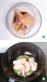 锅置火上倒油烧至五成热,加入姜末、蒜末、葱段炒至金黄色,再倒入鸡翅翻炒半分钟(图②)。
