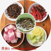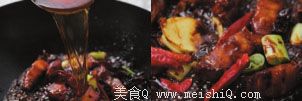 待葱姜辣椒煸出香味后下入霉干菜煸炒,把霉干菜炒至干香后,烹入黄酒炒匀。然后放入酱油炒匀,注入开水,盖上锅盖焖制40分钟。