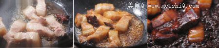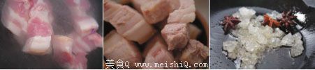 另起一锅,将炒锅烧热,放少许底油煸香八角,然后下入冰糖煸炒,把冰糖煸炒至融化呈浅琥珀色为止。