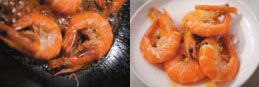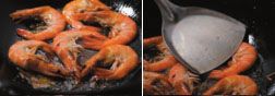 放入煎好的大虾,加盐调味,盖锅用小火焖 2 分钟。最后用中火收汁,稍浓即可。