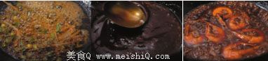 6. 加酱油翻炒着色,加适量水(一般以虾的三分之二)