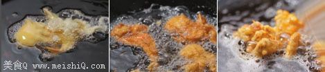 然后将整个蟹块放入油中,以中火炸至蟹壳变红,蟹块呈金黄色,捞起沥干油。