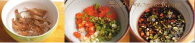 将姜、蒜、青红椒切成细末,倒进碗内,然后把白糖、蒸鱼豉油、鲜贝露、陈醋拌匀成汤汁。静置 10 分钟,使汤汁入味。