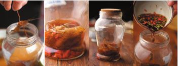 再把枸杞、黄酒倒入有盖的玻璃器皿中,把鲜活虾从清水中捞起冲洗一遍,倒入黄酒中,盖上盖。