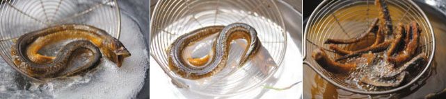 用牙签划出鳝丝,剔除鳝鱼的三角骨。剔除鳝鱼的内脏,清洗干净,沥干水分,拍面粉。入油锅中高温炸至酥脆。