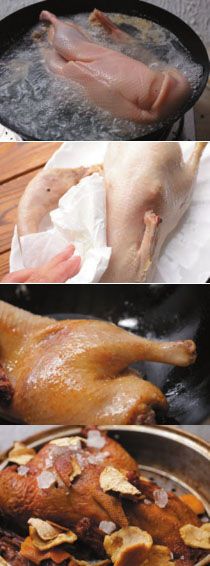 烧一锅开水,放入姜片,将洗净的鸭焯烫 1 分钟左右。捞起并用清水冲去表面的浮沫,用吸油纸吸干鸭表面的水分,放在通风的地方自然风干。