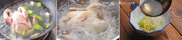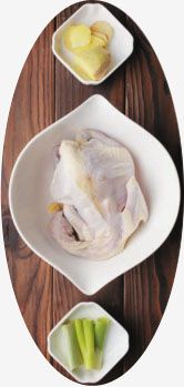 3、为了使鸡皮爽滑,鸡煮好后紧接着用冰开水浸没,使之迅速冷却,从而皮爽肉滑。鸡腔内填冰块是为的是使鸡肉内外冷却一致,也可以不放,直接倒冰开水浸也可。