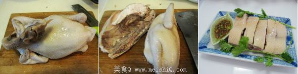 蘸料:(两人份) 生抽四勺 + 姜末一勺 + 鸡汤一勺 + 少许糖、盐、味精、麻油、葱末或五香粉一点点。 香菜洗净,盐水中浸泡杀菌,沥干,配鸡与蘸料,味道爽口.1、煮白切鸡的水不能太少,要能泡着整只鸡2、刚放入锅里煮的鸡捞起倒出鸡肚的水,这样是为了确保里面也受热均匀3、煮鸡的时候不用盖盖子,要大火5分钟,5分钟后关火再盖盖子,煮和焖的时间都要根据鸡的大小而定4、泡冰水是为了鸡的皮滑清爽,还可以把鸡骨里面的血水凝固,这样保持鸡的加鲜嫩。如果不泡冰水的话,以这个时间煮好的鸡斩件后会有血水流出,影响卖相之余肉质也不够嫩滑。