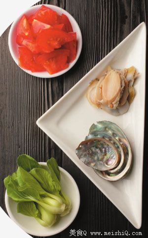鲍鱼切片,西红柿切块。