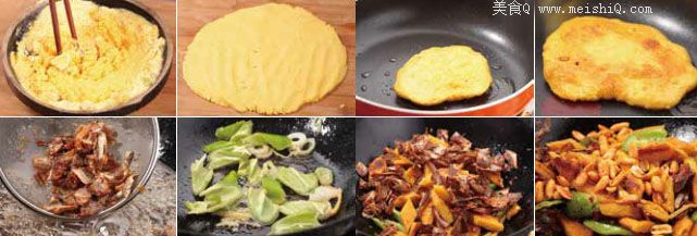 锅内放底油,葱姜末烹锅,随即加入青辣椒段煸炒,加入咸鱼,饼子切成 1 ~ 2 厘米的象眼块入锅,加料酒、少许糖炒透,加花生米炒匀,淋香油即成。