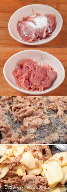 锅中热油烧至七分熟,放肉片煸炒,肉片变白后盛出;