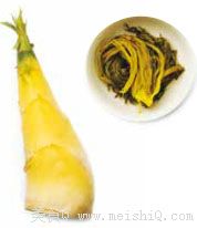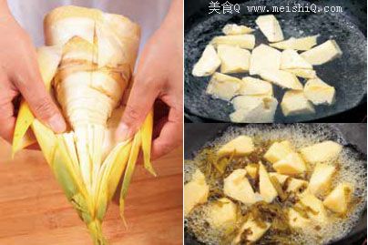 新鲜毛笋去壳、剖开、滚刀切块,雪里蕻梗切段。