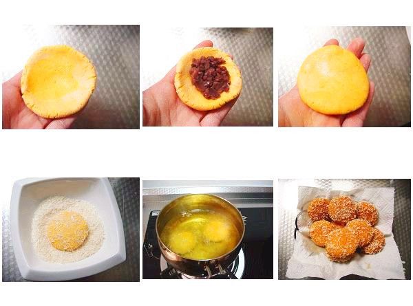 把小剂子揉圆捏成片,包入豆沙,包好,再揉成饼状。