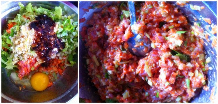 把爆香的姜蒜加入肉末中、再加入蚝油、精盐、鸡蛋、酱油搅拌均匀