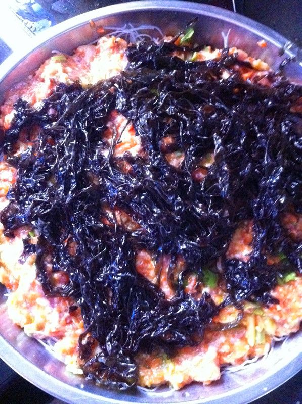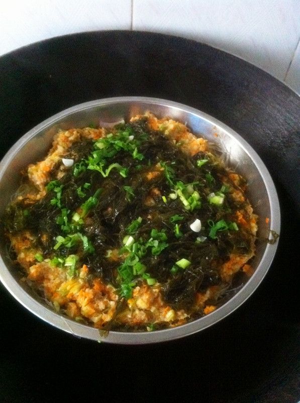 紫菜洗净后挤干水铺在肉末上面、把水煮开后、整15分钟