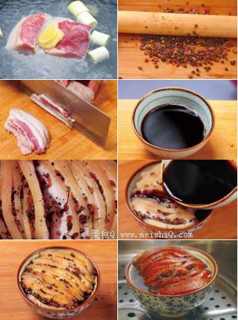 把酱汁浇在摆好肉片的碗中,与肉片持平或略高过肉片;最后再撒上擀碎的花椒,上汽后转微火,2个小时即可,期间注意蒸锅里的水不要烧干。
