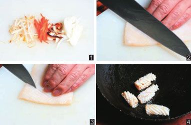 墨鱼和鱿鱼洗净,切片,再切花(图2、图3);将锅烧热,倒入植物油,待油热后,放入墨鱼片和鱿鱼片煸炒(图4);起锅前放入盐和鸡精调味,将墨鱼片和鱿鱼片装盘备用。