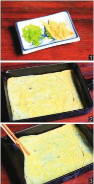 1个蛋打散后,加少许盐调味,放入平底锅中煎成蛋皮后切成长条(图2、图3)。