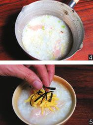 米粒泡开(图4),用盐调味;熄火之前,打入1个鸡蛋。