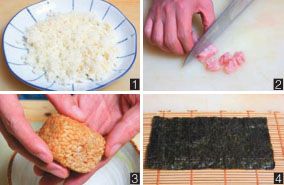 做饭团,最讲究的是米。由于米的品种不同,黏度也不一样,因此,在做饭团时,要选有黏度、有嚼头、冷却后不会散开的米,这样可以保持饭团的形状。饭团里可以根据自己的口味加入不同的馅料——海鲜、肉类、蔬菜、奶酪等。拌好的饭团用保鲜膜包住,可以压出心形、圆球等不同形状。