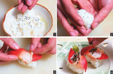 把拌好的寿司饭捏成约20G的梯形饭团,将北极贝覆盖在饭团上,撒紫菜末,拌上寿司醋和芥末拌的蘸酱,食用即可。