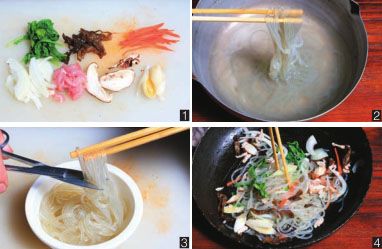 将芝麻放入锅中,炒熟;韩式粉条洗净后,用温水将其泡软,再用沸水煮3分钟,取出(图2)备用。