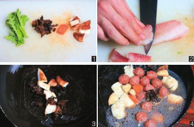 锅中倒入植物油,将香菇、石耳、干辣椒丝、胡萝卜块下锅翻炒均匀(图3),再将蒸熟的真鲷鱼块、香菇、石耳放入锅中(图4)炒熟,最后将焯熟的茼蒿、蛋皮丝摆入盘中即可。