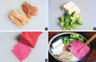 再加入牛肉片、西蓝花略煮(图4),待牛肉片变色,加入鸡精调味即可。