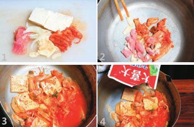 锅中倒入植物油,烧热,爆香蒜末,放入猪五花肉片,烧至肉片变色,下入泡菜块,调入少量辣椒粉,翻炒1分钟左右,加入清水、洋葱丝及豆腐片。