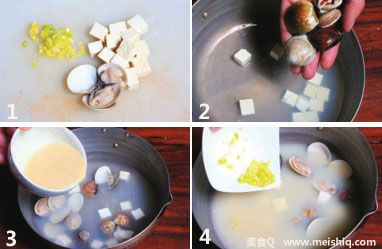 取一个干净的汤锅,倒入适量清水后,以大火煮沸,放入做法1的豆腐块熬煮,待豆腐煮出蜂窝眼儿时,将蛤蜊倒入锅中,熬煮大约15分钟,直至蛤蜊微微开口。