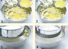 将鸡蛋分三次加入到打发的黄油中,每加一点都要搅拌至鸡蛋液完全被黄油吸收。