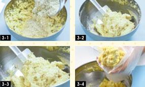 将鸡蛋分三次加入到打发的黄油中,每加一点都要搅拌至鸡蛋完全被黄油吸收。